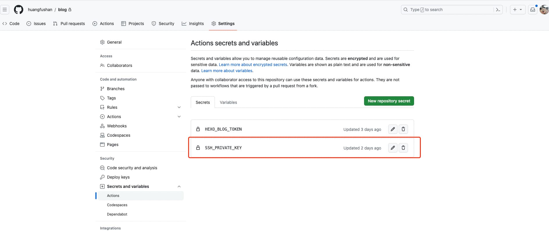 在 GitHub 仓库的 “Settings” > “Secrets” 页面中,创建一个新的 Secret,命名为 SSH_PRIVATE_KEY(或其他你喜欢的名称),并将第一步中的密钥内容粘贴到 “Value” 字段中。